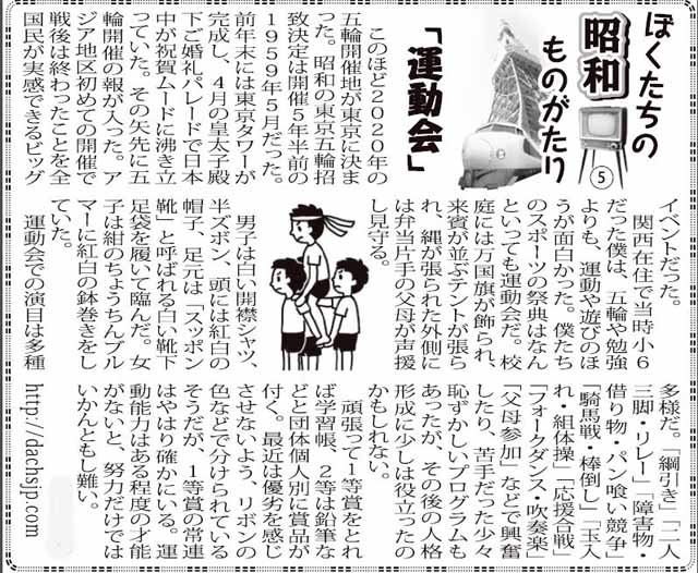 関西在住で当時小6だった僕は、五輪や勉強よりも、運動や遊びのほうが面白かった。僕たちのスポーツの祭典はなんといっても運動会だ。校庭には万国旗が飾られ、来賓が並ぶテントが張られ、縄が張られた外側には弁当片手の父母が声援し見守る。