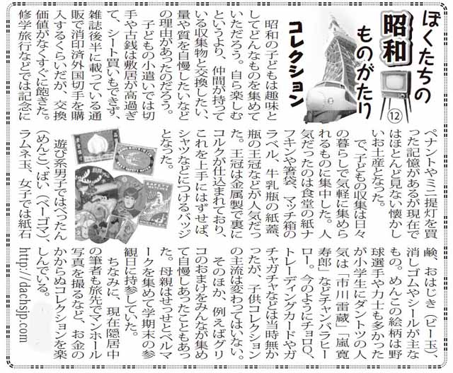 昭和の子どもは趣味としてどんなものを集めていただろう。自ら楽しむというより、仲間が持っている収集物と交換したい、量や質を自慢したいなどの理由があったのだろう。