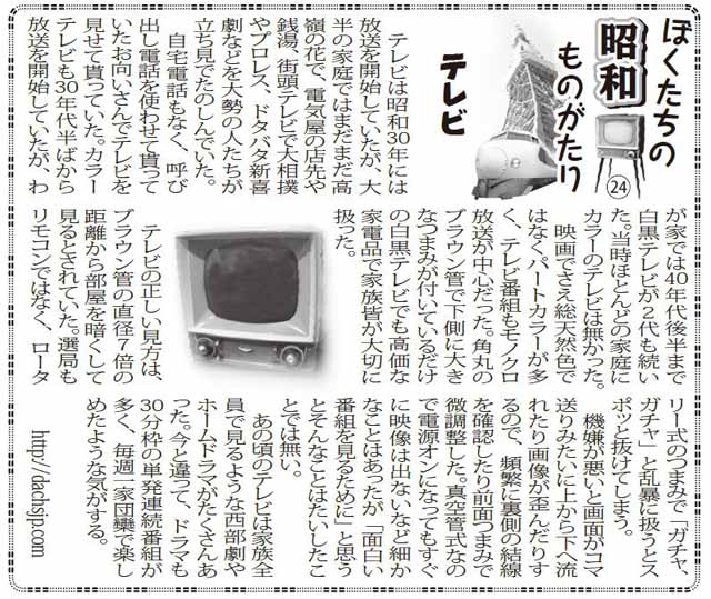 テレビの正しい見方は、ブラウン管の直径7倍の距離から部屋を暗くして見るとされていた。選局もリモコンではなく、ロータリー式のつまみで「ガチャ、ガチャ」と乱暴に扱うとスポッと抜けてしまう。