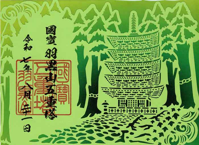 上段の説明 参拝日:令和7年08月21日 場所:山形県鶴岡市羽黒町手向字羽黒山 名称:隋神門五重塔 備考:羽黒山参道、“一の坂”上り口の杉並木の中にある。東北地方では最古の塔といわれ、平将門の創建と伝えられる。現在の塔は、約600年前に再建されたものといわれる。高さが29.0mで、昭和41年には国宝に指定された。近くには樹齢1000年、樹の周囲10mの巨杉“爺杉”がある。 |