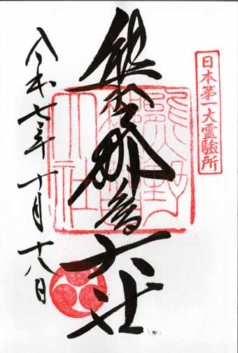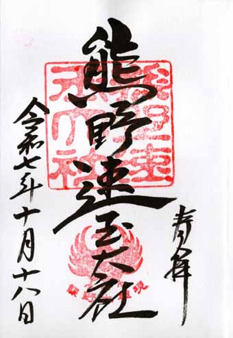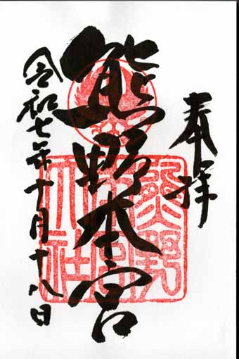 参拝日:令和7年10月18日 場所:和歌山県田辺市本宮町本宮1100 名称:熊野本宮大社 備考:熊野本宮大社(くまのほんぐうたいしゃ)は、和歌山県田辺市本宮町本宮にある神社。熊野速玉大社・熊野那智大社と共に、熊野三山を構成している。家都美御子大神(けつみみこのおおかみ、熊野坐大神〈くまぬにますおおかみ〉、熊野加武呂乃命〈くまぬかむろのみこと〉とも)を主祭神とする。詳しい創建年代は不明であるが、社伝によると崇神天皇65年に熊野川の中洲、現在の大斎原(おおゆのはら)の地に創建されたとされている。日本を統一した神武天皇を大和国の橿原(現・橿原市)まで先導したという神武東征の故事に習い、導きの神として八咫烏には篤い信仰がある。 |  |