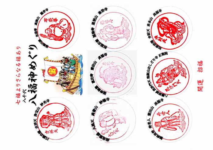 (恵比寿)愛宕山貞福寺(八千代市吉橋804)、(吉祥天)常寶山妙光寺(八千代市小池531)、(大黒天)高誉山妙徳寺(八千代市真木野244)、(福禄寿)星埜山東栄寺(八千代市保品917)、(弁財天)米本山長福寺(八千代市米本1587)、(毘沙門天)池証山鴨鴛寺正覚院(八千代市村上1530-1)、(寿老人)萱田山長福寺(八千代市萱田1427) 、(布袋尊)高津山観音寺(八千代市高津1347)