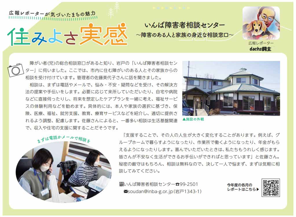 障がい者(児)の総合相談窓口があると知り、岩戸の「いんば障害者相談センター」に伺いました。ここでは、市内に住む障がいのある人とその家族からの相談を受け付けています。管理者の佐藤美代子さんに話を聞きました。