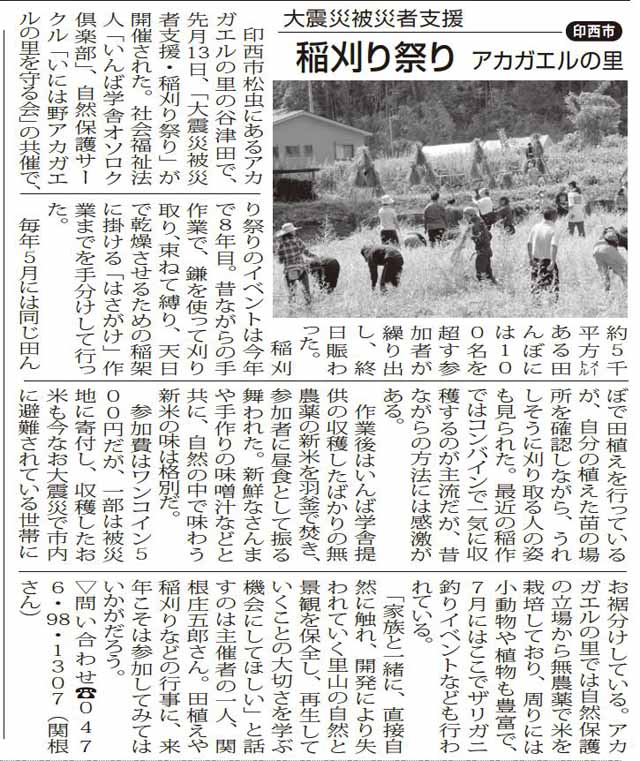 2014年9月13日午前中、いんば学舎オソロク倶楽部といには野アカガエルの里を守る会が主催する『稲刈り祭り』に参加し、取材してきた。サブタイトルは『大震災被災者支援 稲刈り祭り』。